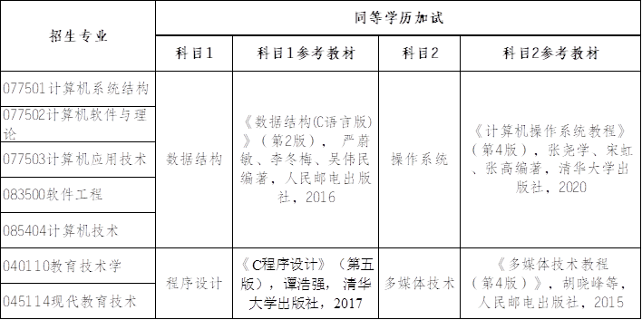 以同等学力参加复试的考生须加试2门与报考专业相关的本科主干课程,加试考核方式为笔试,时间在复试当天通知,考试采用远程开放性测试,利用腾讯会议在摄像头监控情况下进行。试卷电子版发送到考生邮箱,考生打印后答题,完毕后拍照打包发送到学院指定邮箱,收到邮件算交卷成功。同等学力加试科目见下表。