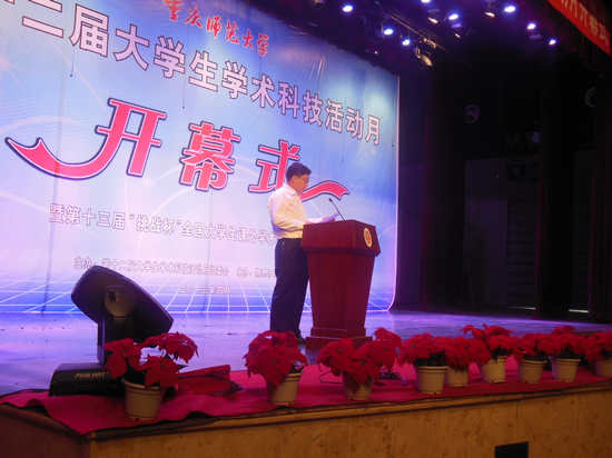 为进一步营造浓厚的校园科技创新和学术研讨氛围,引导广大青年学生崇尚科学、追求真知,培养同学们理论联系实际的学术作风、认真严谨的治学态度和坚持不懈的钻研精神。我校特于2013年4月25日下午2:30在校友会堂举办了第十二届大学生学术科技活动月开幕式暨第十三届“挑战杯”全国大学生课外学术科技作品展活动。出席本次活动的领导有孔春阳副校长,党委宣传部、教务处、学生处、科研处、研究生处、校团委等部门领导,各学院学生代表和指导老师参加。
