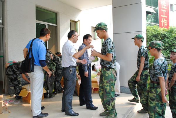 2012级424名军训学员在指导员朱嘉洁、傅帆有效组织下早早的集合在部队医务室楼下的广场。领导刚下车就迎来了新生一片欢呼和热烈掌声,领导和老师心系学生,被现场热烈气氛深深感染。