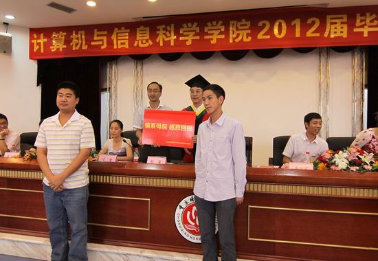 “祝你们一路顺风、前程似锦!”。学生代表孙柳艳上台代表毕业生发言,充满了对母校的不舍和热爱。随后,主持人颁发校友联络员聘书、学院院徽设计奖、以及2012届毕业生代表为学院捐赠纪念品。