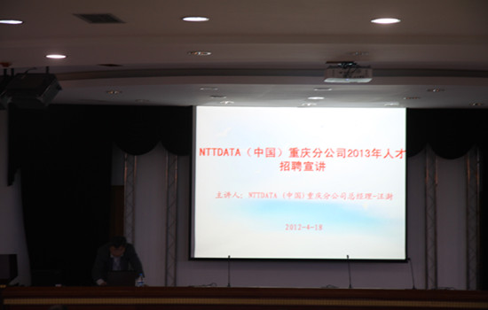 在凯撒报告厅举办了NTTDATA(中国)重庆分公司2013年人才招聘专场宣讲会。学院2013届全体学生与学院党总支副书记杨宇、辅导员朱嘉洁一起聆听了由NTTDATA(中国)重庆分公司人才开发室室长周宜聪作的招聘宣讲,NTTDATA(中国)重庆分公司高层领导参与会议,会议由杨宇副书记主持。