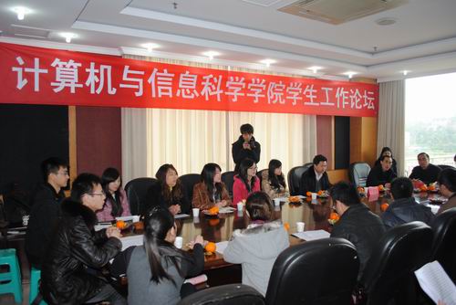 接着,学生代表围绕 “团队建设”、“考研工作”、“学风建设”等八项论题与领导进行零距离交流。学生党员代表胡倩在论坛上建议学院定期开展读书读报等活动;建议老师在教学过程中多与学生进行思想交流,利用课堂提问和网上聊天的形式了解学生专业需求与思想动态。