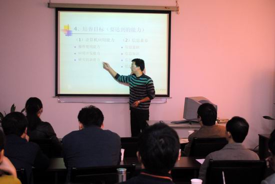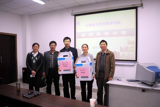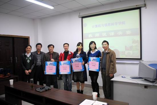 于10月下旬至11月上旬开展了学院说课竞赛活动。活动分两个阶段进行:第一阶段分组赛,于11月4日下午进行,由各系(计算机基础系、计算机科学与技术系(软件工程系)、电子商务与信息管理系)安排,组织本系45岁以下的所有老师进行说课比赛,根据比赛结果推荐两名教师参加学院竞赛;第二阶段由学院组织决赛,于11月11日下午在学院233会议室举行,参赛队员为前一阶段推出的六名老师组成,由各系主任、副主任及督导组老师担任评委。经过两个多小时时间,先后6位参赛老师分别结合各自所授“一门课”的课程的课程目标、课程内容、课程实施、课程评价及课程改革等和“一堂课”的教学目标、教学内容、教学过程及效果评价等几方面进行了精彩的演说,经过评委们认真评选,最后叶青、刘云杰两位老师获得优胜奖并代表学院参加学校说课复赛,罗凌、杨卫明、江军、李晓虹四位老师获得优秀奖。