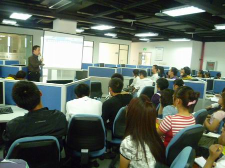 中软国际(重庆)校企合作部张正霆经理热情的接待了大家,对大家的到来表示热烈的欢迎,并带领大家参观了中软国际各个部门。同学们排着整齐的队伍,在张经理的引导下进入公司的各个部门,从前台到实训室,张经理耐心的为大一新生讲解公司的发展历程以及人才的培养流程,并留充足的时间与同学们交流。随后,同学们来到4楼培训室,张正霆经理为大一新生带来了一场题为《软件行业职业发展规划——从大学生的认识误区谈起》的专题讲座。在讲座中,张经理就中国软件行业的发展前景作了详细的介绍,并鼓励在场的同学们潜心专研,为中国软件产业发展添砖加瓦。针对同学们存在的“软件就是写程序”,“IT从业人员的出路就是写代码”,“做软件就是要使用最新的技术”等常见认识误区作了一一详细的分析和解释。最后,张经理就软件人才的技能要求及发展方向方面为同学们做了一一梳理,提出一个合格的软件人才必须拥有“六艺”、“二技”、“二专”,并强调软件企业对于大学生除了看重基本的专业技能和综合素质外,更需要的是关于软件开发的经验。因此鼓励同学们在校期间要尽可能的积累相关经验。讲座后同学们还就软件行业的相关问题与张经理进行了深入交流。