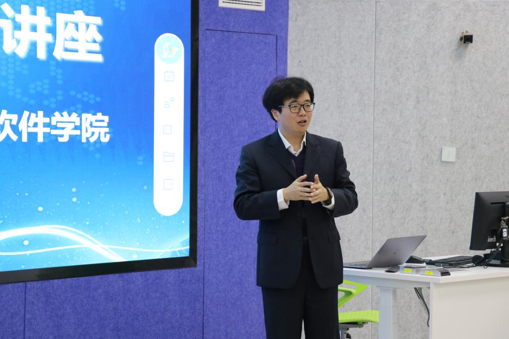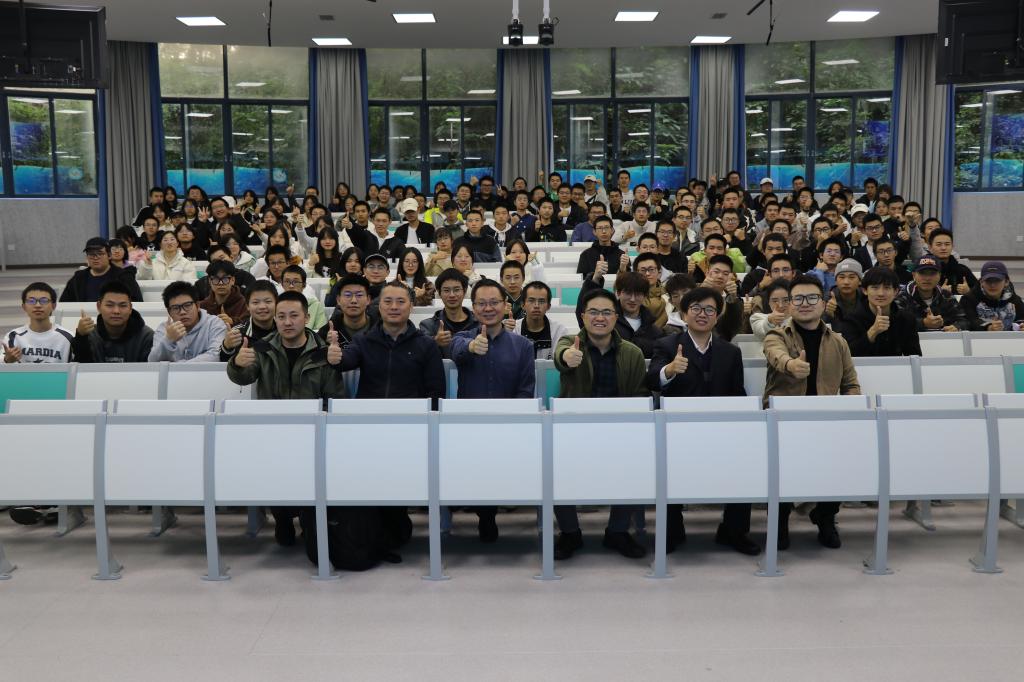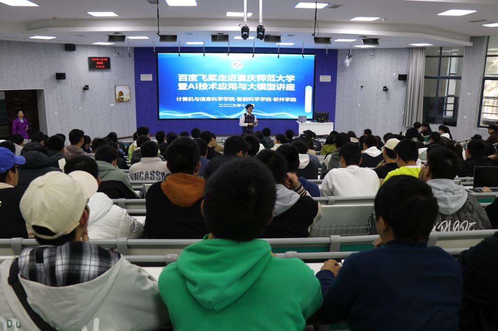 百度飞桨领航团长张青军和软件工程与智能科学专业的一百余位学生。讲座由计信学院软件工程系主任冯骥主持。