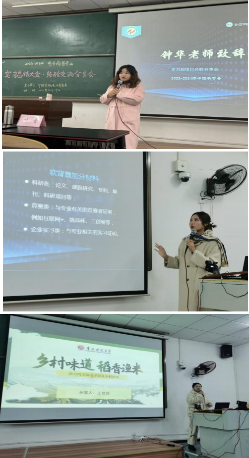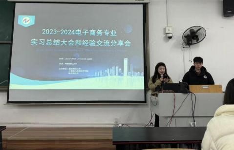 电子商务系在励志楼 2208 教室召开 2023—2024学年实习总结和经验交流分享会。副院长冉瑞生、电子商务专业负责人李明、电子商务系主任陈代江、专业教师叶青、学工办主任钟华和电子商务专业2021、2022 、2023 级学生参加。