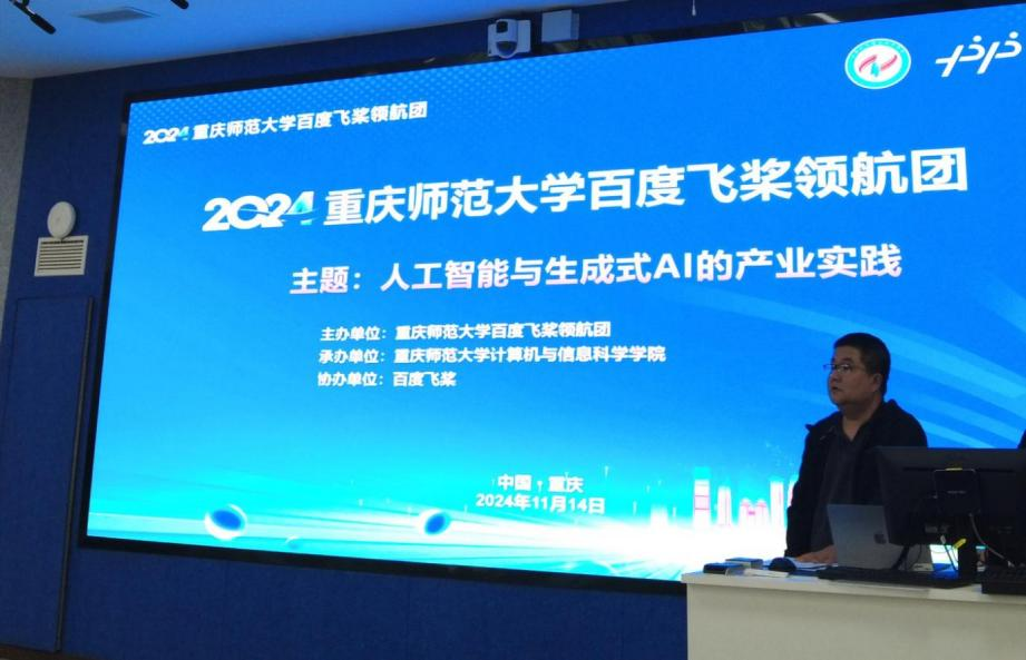 在弘德楼15105室举办了“人工智能与生成式AI的产业实践”讲座。讲座邀请了飞桨·文心大模型西南区域教育生态负责人黄凯、百度智能云高级解决方案工程师丁海珂作报告,兔子先生