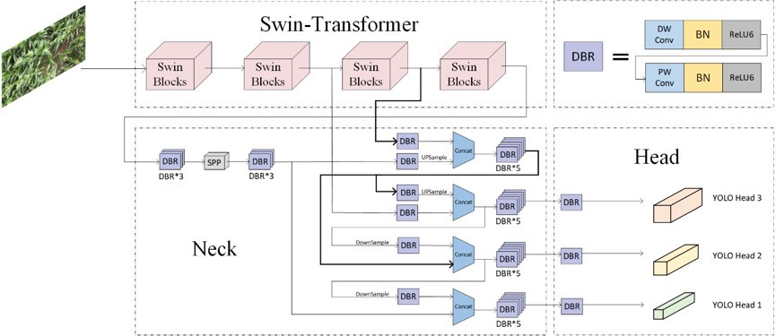 玉米雄穗在玉米生产及品种鉴別等方面具有重要的作用,其性状在一定程度上也和产量相关,自动监测玉米抽雄期能有效观察玉米生长状况,现阶段的玉米雄穗检测方法无法很好地完成实时检测任务。为了解决这些问题,本文提出一种兼顾检测精度与检测速度的新检测模型SwinT-YOLO。以检测精度高但参数量和计算量较大的YOLOv4作为检测的基准模型,使用轻量级神经网络Chostvet替换YOLOv4的主干特征提取网络,在加强特征提取网络中使用深度可分离卷积模块替代普通卷积模块,并将激活两数更换为稀疏性较强的ReLU6,从而有效地进行轻量化。使用无人机在中国西南地区的玉米农田采集数据样本,随机采用镜像对称仿射变换、高斯 加噪、对比度变化的方式对数据样本增强,使试验模拟出复杂环境下的玉米雄穗在不同气候与光照呈现出不同的特征。结果表明,新模型适合部署在无人机平台上进行玉米雄穗的实时检测,综合对比各个模型的精度、检测速度、模型參数,新模型的各项指标优于其他检测模型。