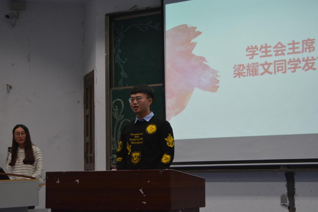 在这之后,大家观看了一段由团学会干部所拍摄的视频。幽默诙谐的风格调动起全场气氛,现场掌声不断。随后,每个部门的成员依次上台介绍自己的部门,出其不意的介绍方式和表演让人捧腹大笑,笑声中无形增进了大家的紧密度和团结性。最后,干事代表胡成涛同学进行了发言,代表所有新成员表明决心,成立大会到此结束。