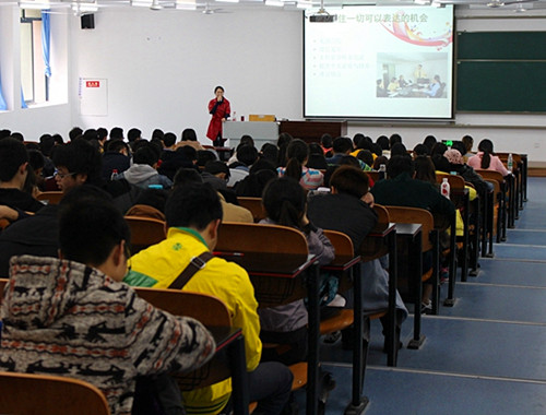 讲座围绕“认识自我”、“挖掘我的潜能”、“你的颜值”、“专业是必要”等四个方面展开的。讲座之初,丁老师分析了去年和今年严峻的就业形势,并以在座的四百多名同学为例进行了就业率分析。她提出了“敢不敢”小活动,拉动了同学们的积极性,现场的氛围随即活跃起来,通过这种有趣的活动,帮助同学们以最简单有效的方法更深刻地认识自己。