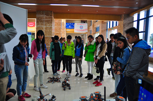 的影响力。在本次“挑战杯”科技作品竞赛中更是展示了极具学院特色的以C语言程序为基础设计的七项科技作品。他们分别是蜘蛛形的“六组机器人”、遥控“足球运动员”、通过测间距来感应最终达到平衡的“平衡感机器人”、捡棒球的“拾球运动员”、可以自动写书法的“小书童”、“电子狗”以及一款高效的小学生学习软件。参赛学生通过演示详细地为学校领导及同学介绍了每一项科技作品的功能。期间,兔子先生