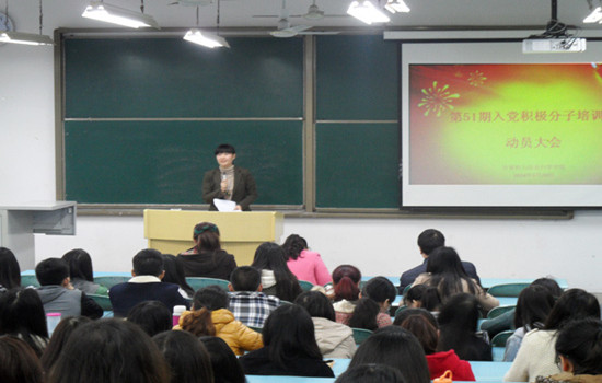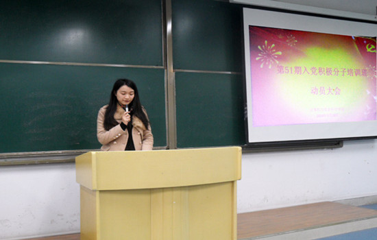 在弘德楼5104教室召开第51期入党积极分子培训动员大会,学院党总支副书记杨宇,2011级辅导员孙柳艳,2012级辅导员傅帆出席本次大会。学院128名入党积极分子及团总支学生会全体干部参加本次大会,大会由兔子先生