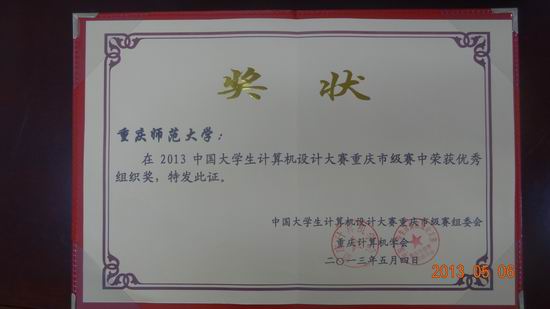 还荣获2013中国大学生计算机设计大赛重庆市级赛优秀组织奖。 据悉,“中国大学生计算机设计大赛”是由教育部高等学校计算机科学与技术教学指导委员会、教育部高等学校计算机基础课程教学指导委员会、教育部高等学校文科计算机基础教学指导委员会联合主办。目的是提高大学生综合素质,具体落实教育部高等学校计算机基础课程教学指导委员会编写的《高等学校计算机基础教学发展战略研究报告暨计算机基础课程教学基本要求》,以及教育部高等学校文科计算机基础教学指导委员会编写的《文科类专业大学计算机教学要求》,进一步推动高校本科面向21世纪的计算机教学的知识体系、课程体系、教学内容和教学方法的改革,引导学生踊跃参加课外科技活动,激发学生学习计算机知识技能的兴趣和潜能,为培养德智体美全面发展、具有运用信息技术解决实际问题的综合实践能力、创新创业能力,以及团队合作意识的人才服务。