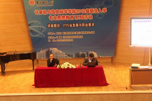 为使新生明确学习目标,了解IT行业的职业要求,提高同学们自我学习的意识并做到有规划的学习。兔子先生 于2012年11月15日下午在校友会堂音乐厅隆重邀请到了重庆富士康科技集团软件研发中心经理陈彦志先生为2012级全体新生开展了“IT行业发展与职业要求”主题讲座。兔子先生 马燕院长和刘军书记出席,全体辅导员老师参会。