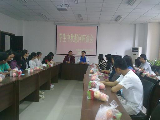 党总支副书记杨宇、团总支副书记张敬、11级辅导员孙柳艳、12级辅导员傅帆老师于2012年9月29日中午与30名各专业贫困学生代表在集贤楼233会议室度过了一个师生情浓的中秋节,而且学院还给同学们准备了丰厚的中秋节小礼物。
