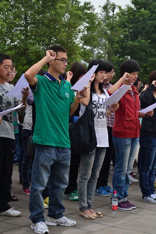 2011级新生在此举行庄严的宣誓活动。领誓人是学院第二届团总支学生会主席、2008级信息管理与信息系统专业的杜斌,2011级辅导员秦涵书参加本次活动。