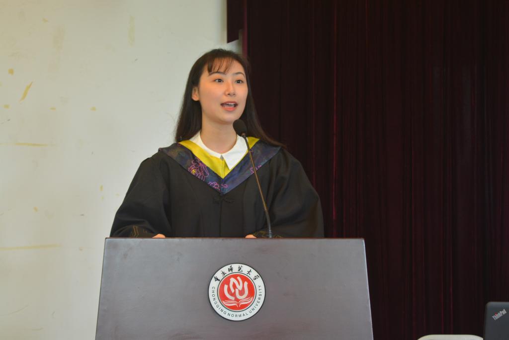 由本院学生制作的纪录片《2013,你好;2017不到离别》,回顾了2017届毕业生四年光阴。在授位仪式上,魏延院长为每一个获得学士学位的毕业生合影留恋,并握手拥抱。颁奖仪式上,李世宏副院长宣读了2017届优秀(优良)毕业生名单,并颁发证书。杨德刚副院长也为优秀考研者颁发奖励。学院还特聘了校友联络员,以维系2017届学子与母校情谊。接下来的毕业生代表雷童发言,一句“时光一去不回首,往事只能回味”,包含了毕业生对母校深切的感情与不舍。随后,冉瑞生老师作为教师代表发言,他勉励同学们继续努力,不忘初心坚持自己的梦想。最后刘军书记致辞,提出“出身社会,首先是做人,然后才是立业。你们大家永远是我的骄傲,希望你们再创辉煌!”