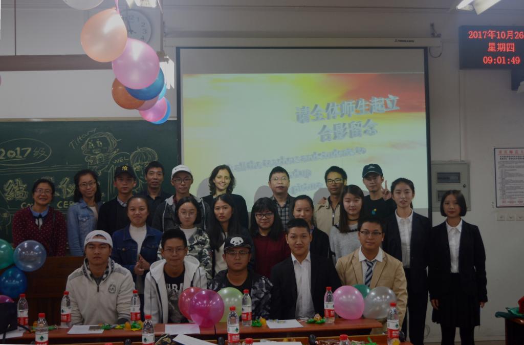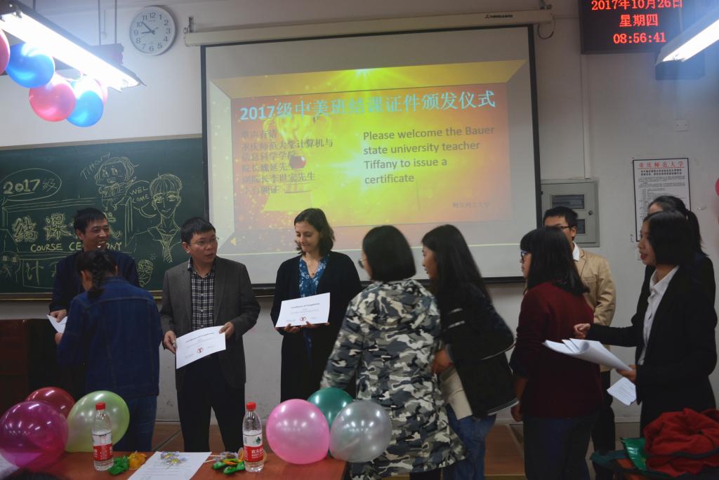 为使中美的同学们能更好的学习英语,了解英语语言的文化背景,学校开设了“美国文化概论课”,任课教师为Ball State University Faculty Ms.Tiffany Ellis(鲍尔州立大学教师 Tiffany Ellis 女士)。用美国大学的教学模式给同学们上课,讲解鲍尔州立大学环境与美国文化,使同学们视野更加开阔。通过短短三周的学习,同学们收获颇多,临近外教老师回国之际,美国文化概论结课仪式正式开始。仪式首先由魏延院长与李世宏副院长发言,鼓励同学们好好学习英语并对Tiffany老师表示感谢。接着是学生小组向老师展示英文PPT,学生演讲人knight上台演讲,学生代表Chris(罗霄)、Alessia(曹琴)、Rex(杨锐熹)、Angela(刘露霜)、Harel(刘徽)、Breezy(陶志恒)发表课程感想以及对老师的感谢与不舍。紧接着,由魏延院长、李世宏副院长、Tiffany老师为中美的同学颁发结课证书,全体师生合影留恋。之后,同学们踊跃的发言关于自己在这门课所学到的知识与自身的改变,他们由最初不敢与外教老师交流到现在能自信的与老师沟通,虽然课程是短暂的,可同学们的改变是显而易见的,他们不怕离别,因为他们相信,他们将会在外教老师的国家与她重逢,这使同学们更加坚定了出国发展的梦想。最后,Tiffany老师用歌声来回应同学们的热情,并期盼着与同学们再次相逢的那天。