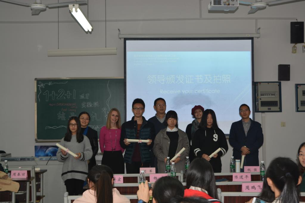中美1+2+1项目”他们了解到美国鲍尔州立大学的课程情况和丰富多彩的课余活动。在与两位老师一起做活动策划时,不仅填补了自己在做策划方面的缺口,还不经意间提升了英语交流水平;最后对学校领导提供如此珍贵的学习机会和老师们的悉心教导表示感谢。仪式最后,各学院领导为参加“重庆师范大中美1+2+1项目”的同学们颁发结业证书。当同学们拿着毕业证书与老师们合影时,脸上都情不自禁的露出了笑容。