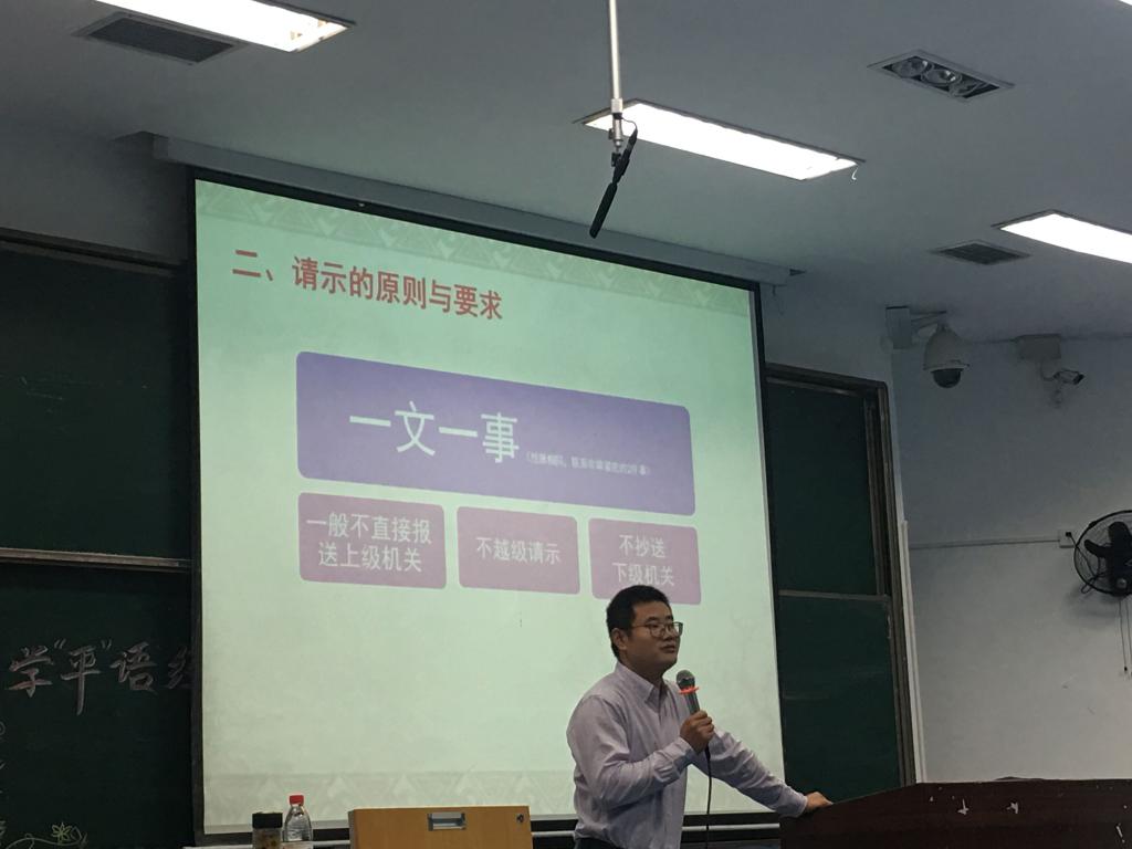 在前期职业意向分组的基础上,先后于2018年10月14日和11月4日开展了两场针对公务员方向就业学生的公文写作团辅。校汤海鹏老师担任主讲人,院团委书记钟华老师任主持人。