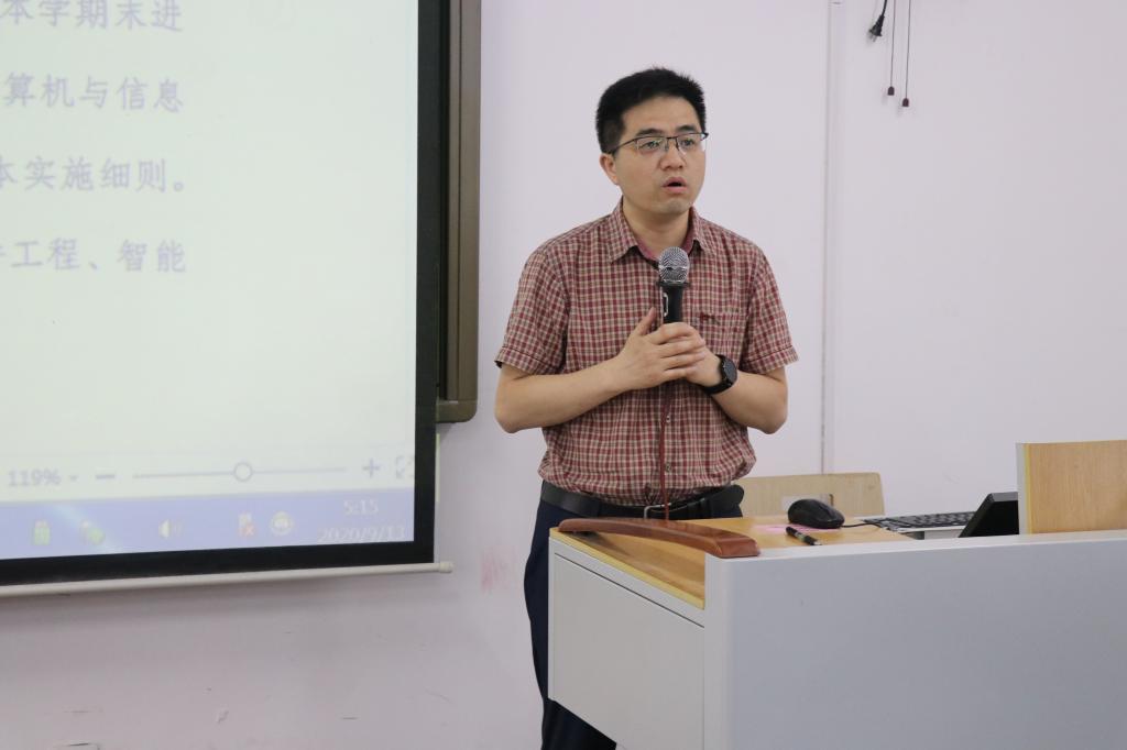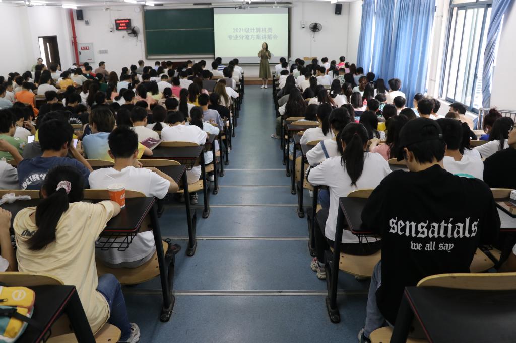 在砺志楼2208举行2021级计算机类专业分流实施细则讲解会暨菁英班动员大会。分管本科生教学副院长冉瑞生,智能科学与技术系主任朱德利,智科专业负责人曾绍华率智科系全体教师参会, 辅导员刘宇,2021级计算机类全体学生参与,辅导员傅帆主持会议。