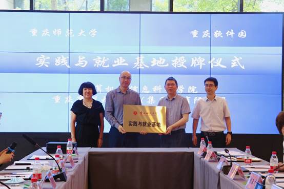 副校长陆远权代表学校与重庆软件园董事长杜婷婷签署了“实践与就业基地”协议并授牌。陆远权副校长做了讲话。他谈到,此次交流很受启发,希望今后能进一步“走出去,请进来”,并代表学校欢迎企业来校交流,期望企业与学校在此次对接会后加强人才联合培养、人才输送与引进等方面的合作,在区域发展中贡献“重师力量”。