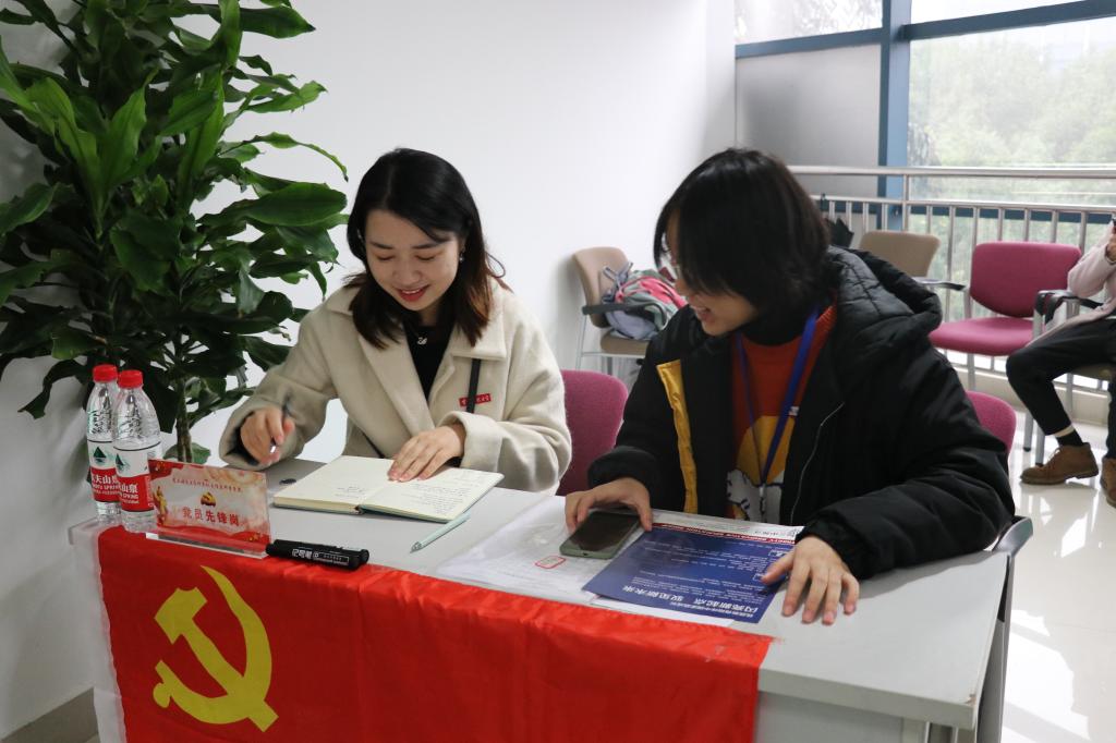 20191128日,计信学院学生支部党员在计信学院2020届毕业生双选会上,设置“党员先锋岗”,几十名学生党员投入双选会志愿者工作,为30余家企业和300多名毕业生提供热心、贴心的接待与就业指导等服务。