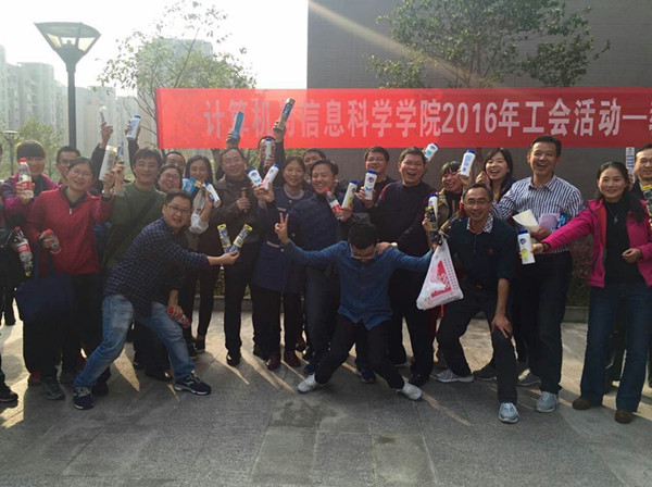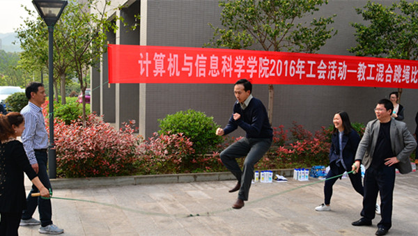 工会主办的计信2016年教工混合跳绳比赛在学院楼前开展。