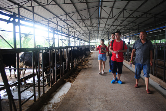 最有特色的企业莫过于第一小组所前往林久农牧综合开发有限责任公司。该公司是以发展循环农业为主的综合农产品公司,主要产品有龙眼、有机蔬菜以及鲜牛奶。据董事长林久的介绍,林久牧业现拥有奶牛150头,其中许多已经怀孕,预计到明年这个数字将会增加到300。拥有有机桂圆100亩,有机蔬菜田若干亩。当队员们问到农场是如何实现循环时,林董回答道:“奶牛所产的粪便,是蔬菜和桂圆最好的肥料,而成熟的有机蔬菜,便是奶牛最好的饲料。”听了林董的回答,队员们都对这样的运营方式佩服不已。最值得一提的是,农场里的鲜牛奶,已达到欧盟标准,不仅为天友乳业提供奶源,还创办了自主品牌—牛丫头,是云阳片区唯一一家能喝到“巴氏牛奶”的牛奶品牌。不过据林董介绍,他的“巴氏牛奶”虽然独特,却不知名。因此希望借此次与重师大合作的机会,借助我校服务团的力量,为林久牧业的牛奶搭建网上宣传平台。队员们表示此次“三下乡”目的便是将科学带进农村,将电子商务带进农企,因此定当竭尽全力帮助林董。