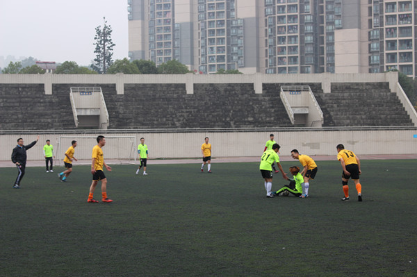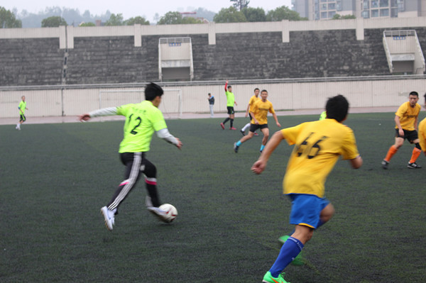 裁判一声令下,比赛开始。双方队员斗志满满,互不相让,比赛陷入胶着。第25分钟,场上风云突变,计信学院打出一次精妙的二过一配合,12号队员曾扬沿左路杀入教工队禁区小角度射门,球直入对方大门左下角, 1:0,计信学院领先,5分钟后,计信10号队员黄起帆中路突破成功,面对门将抽射,球划着一道美妙的弧线直挂教工队球门右上角,2:0,计信学院扩大了领先优势,并将优势保持到了上半场结束。下半场,教工队调整了人员和战术,并很快收到成效,第65分钟,教工队利用一次角球机会,将比分改写为2:1,随着比赛的推进,教工队体能劣势显现出来,连续被计信学院得分,计信12号曾扬连入两球,将比分改写为4:1的同时完成本场比赛个人帽子戏法,伤停补时阶段,教工队打入换回面子一球,将比分锁定在4:2,全场比赛结束。