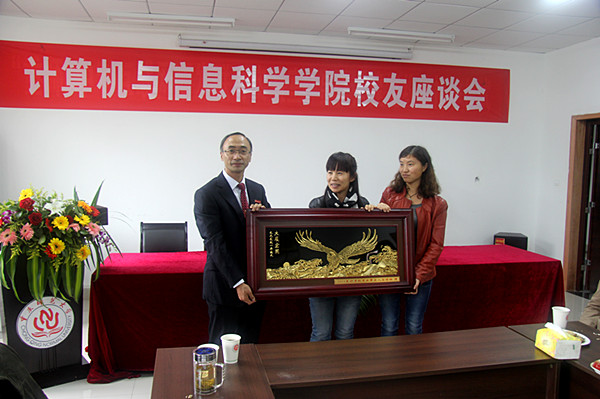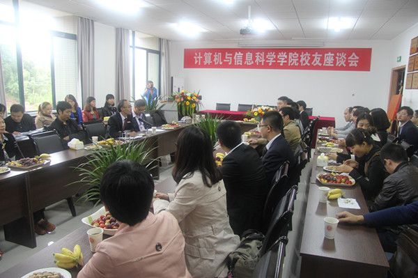 下午四点校友分成两组回到各自专业系所同老师们展开更深入的交流。计科系戴政国老师向校友们介绍了近年来学院的发展,对现下教学模式的改革进行了介绍,也为兔子先生