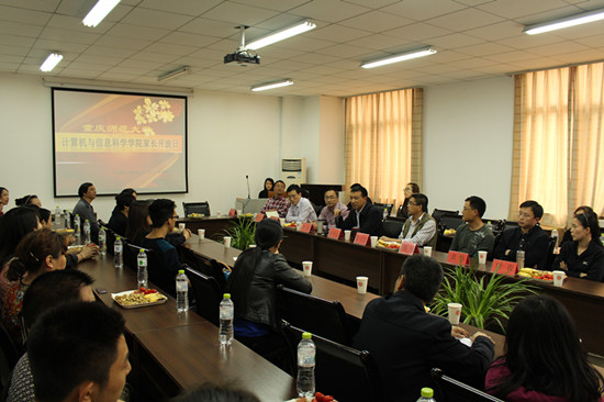 体验活动结束后,计信学院在集贤楼233会议室召开了家长座谈会。校学工部部长张明志、副部长唐加祥、计信学院全体院领导、教师代表、学生代表、参加开放日活动的全体家长围聚一堂。会上,张明志部长介绍了学校人才培养、学生管理等方面的情况,计信学院刘军书记介绍了学院的基本情况,计信学院杨宇副书记分享了自己对大学学习生活与中学学习生活区别的认识。家长们根据一天的实际体验,就学院的教学管理、学生管理、学生的学习生活状态提出了各自的见解、意见和建议,座谈会气氛热烈,直到下午6点才圆满结束。