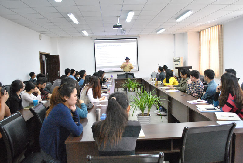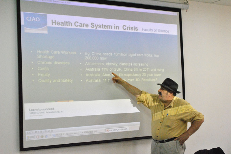 讲座期间,Andrew教授用幽默的谈吐、流利的口语营造了一个愉悦的氛围。他先从不同的角度探讨了目前国内外健康护理工作中存在的不足之处,着重强调了健康护理工作质量和安全的重要性;紧接着详细介绍了健康产业中利用信息技术的几种发展形式。最后他结合自己多年的生活和工作经验,把信息技术在健康产业中的实际应用作了生动的描述,提出了“IT and TCM可以辅助健康护理系统”的观点,鼓励同学们深入研究,并为同学们指出了一些有发展空间的研究方向。最后,Andrew教授对与会者的提问进行了耐心的回答。