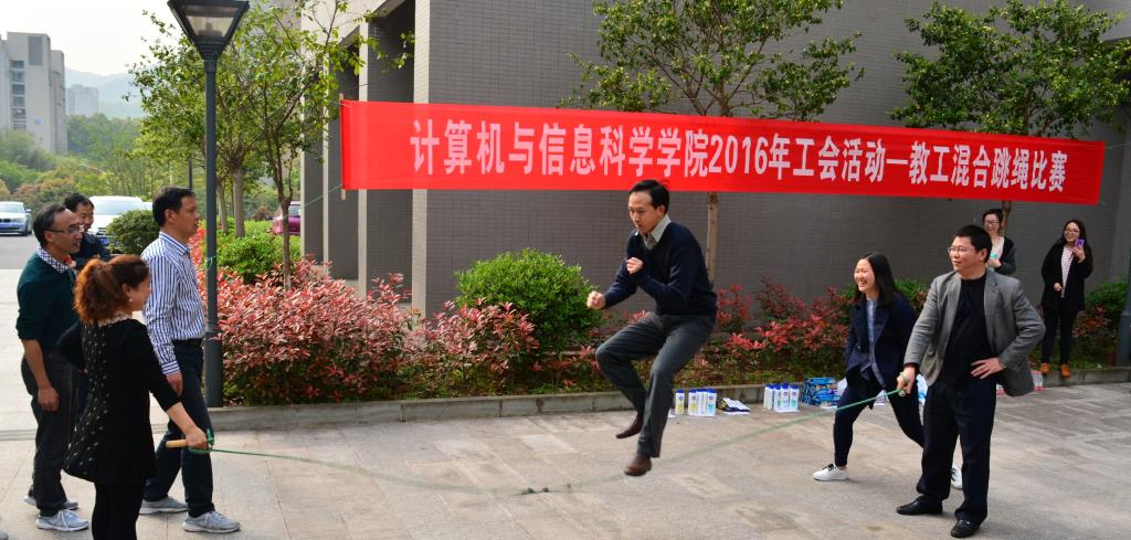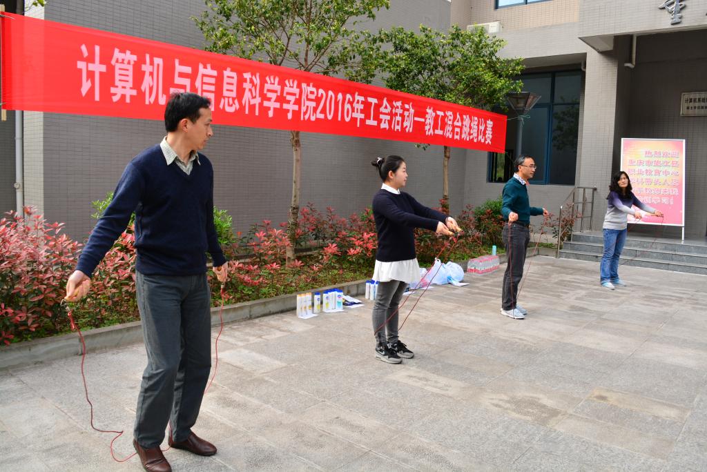 工会主办的计信2016年教工混合跳绳比赛在学院楼前开展。