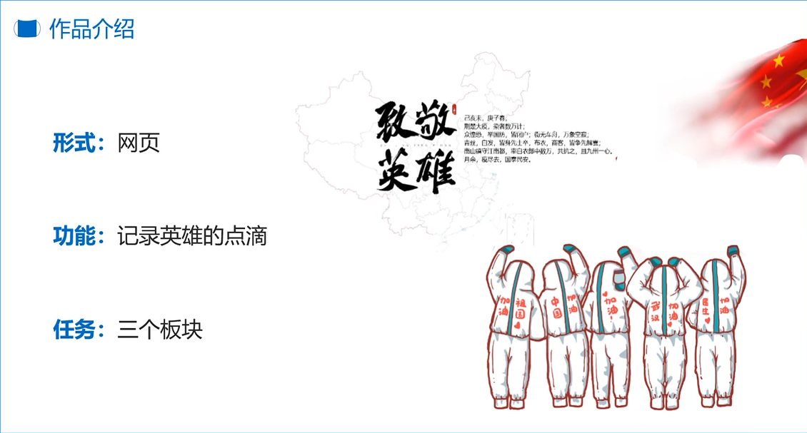 学院唐万梅教授作为第一批学校课程思政示范教师,积极推进Python专业课程与思政融合,在专业教学中融合爱国主义教育、形势政策、法治教育等思政内容,在学院教师中发挥示范作用。今年,新冠肺炎爆发以来,唐老师想到了如何引导学生在疫情中深受教育,组建学生团队完成与疫情相关的项目,既培养学生的编程能力,也加深学生对疫情的感受。在唐老师的精心指导下,学生团队制作了“战役.致敬英雄”网站。用网页的形式记录下了全国各地医护人员和人民解放军支援湖北省的详细数据,以此来纪念此次抗击疫情中的最美逆行者,让我们记住所有为这次疫情做出杰出贡献的可爱的人们,致敬英雄,也愿逝者安息。